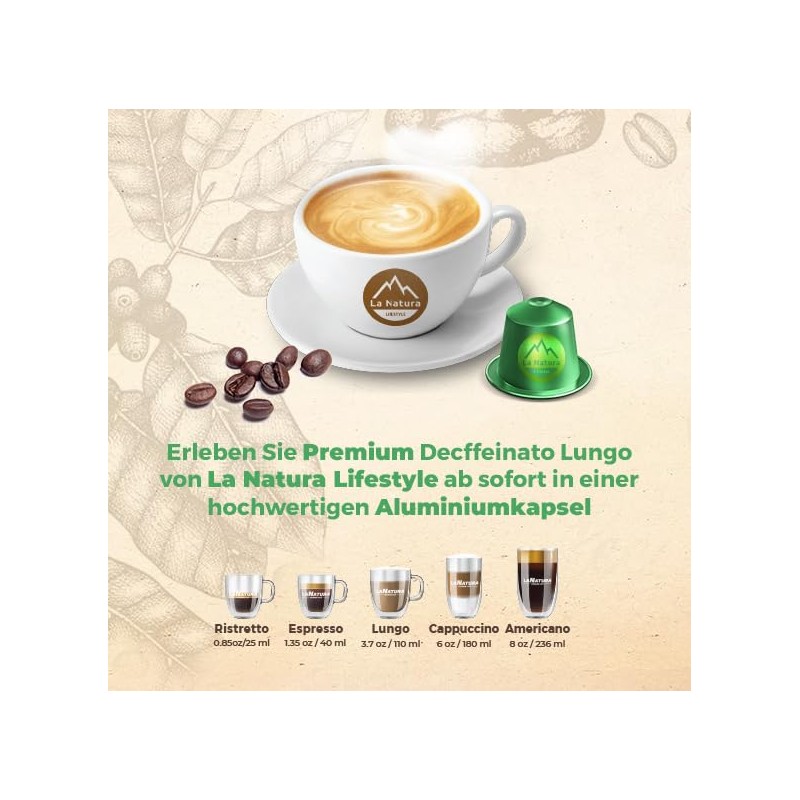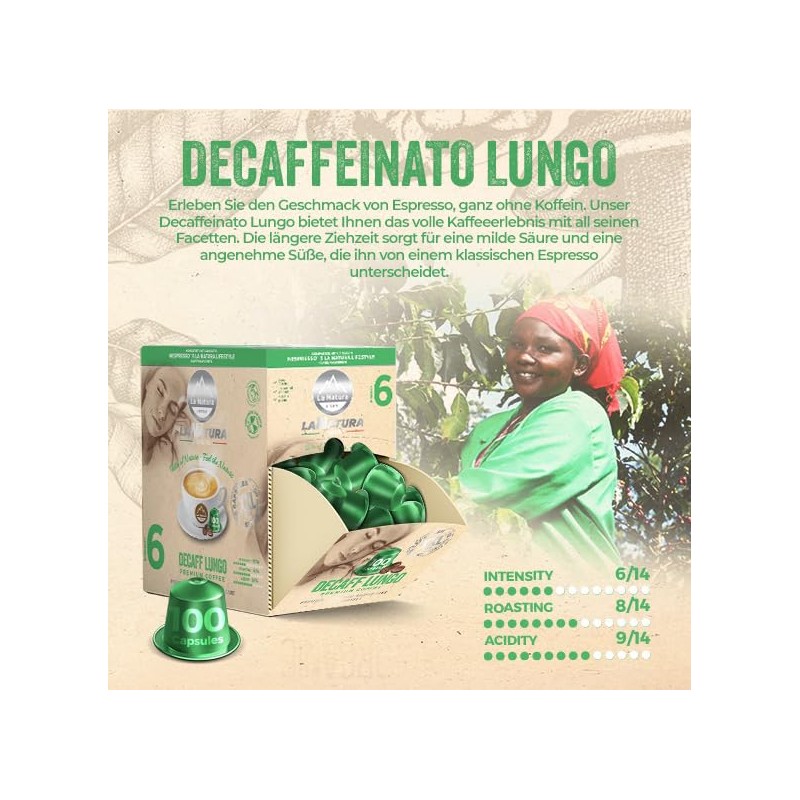 DECAFFEINATO LUNGO COFFEE, 100 Coffee Capsules Compatible with Nespresso Capsule Machines, Caffeine-free Coffee Lungo, by La Natura Lifestyle