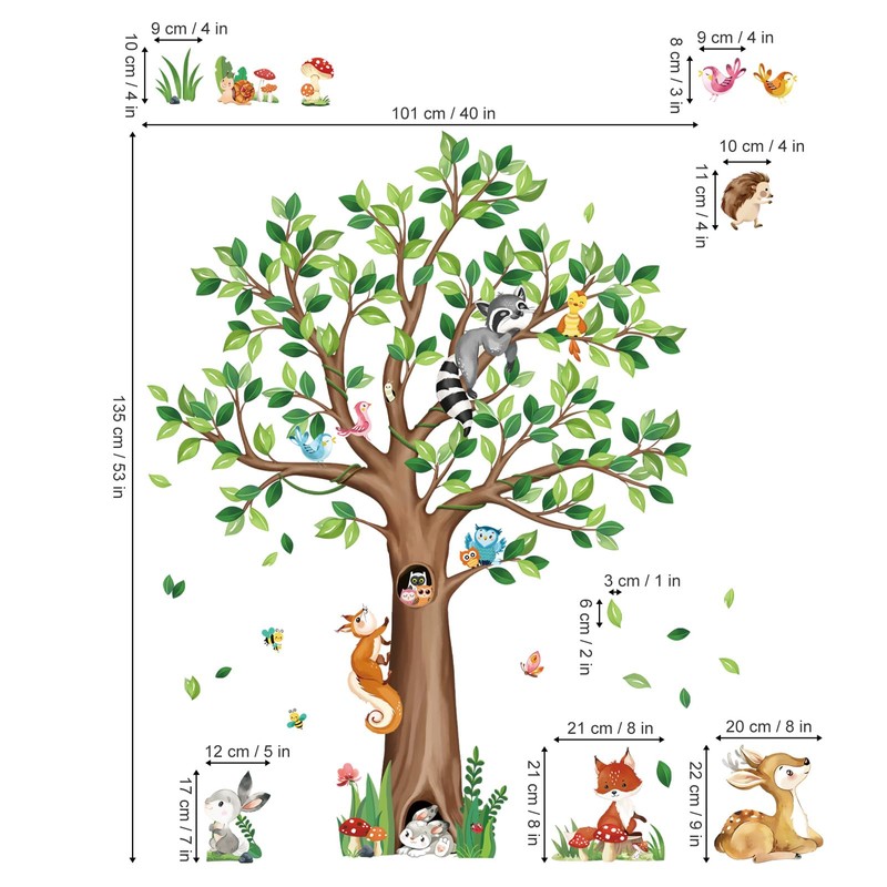 This woodland animals large tree wall sticker contains deer, foxes, squirrels, rabbits, hedgehogs, owls and birds, is beautifully designed to decorate your room with style and warm effects