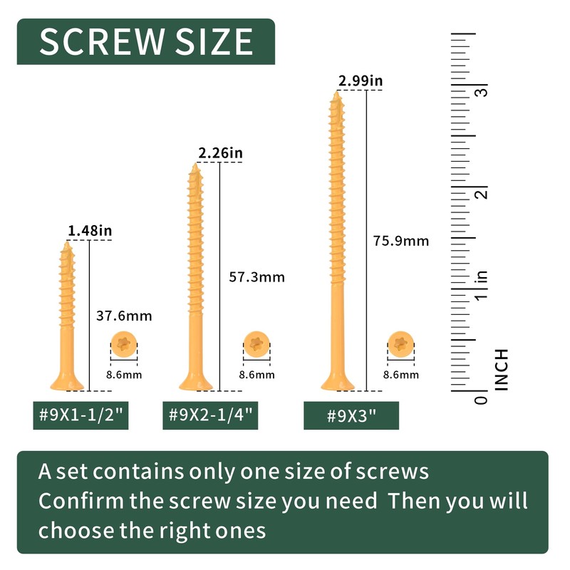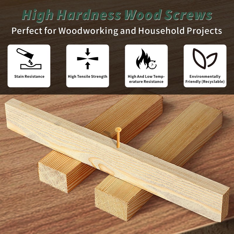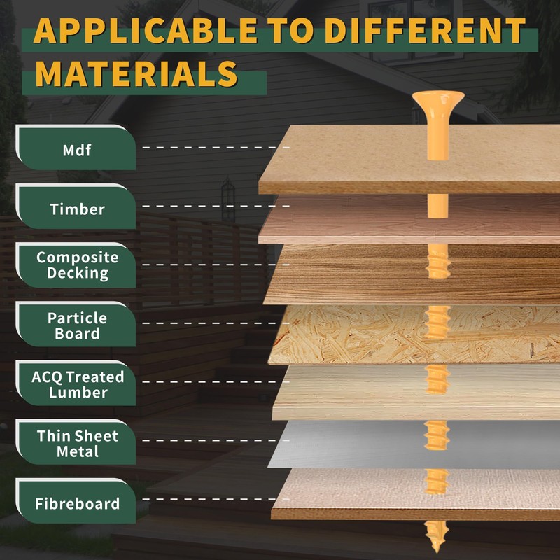 - 【WIDE APPLICATION】The wood screws with tan plated suitable for most woodwork because tan is similar to the color of wood. These screws can be used in multiple materials, including thin timber, composite decking, particle board, ACO TreatedLumber, fibreboard, MDF, chipboard, softwood, and hardwood. They are suitable for a variety of woodworking projects, such as decking, framing, fencing, and other outdoor applications. It is also suitable for indoor decoration, such as beds, cabinets, chairs, tables, mural decorations, etc.