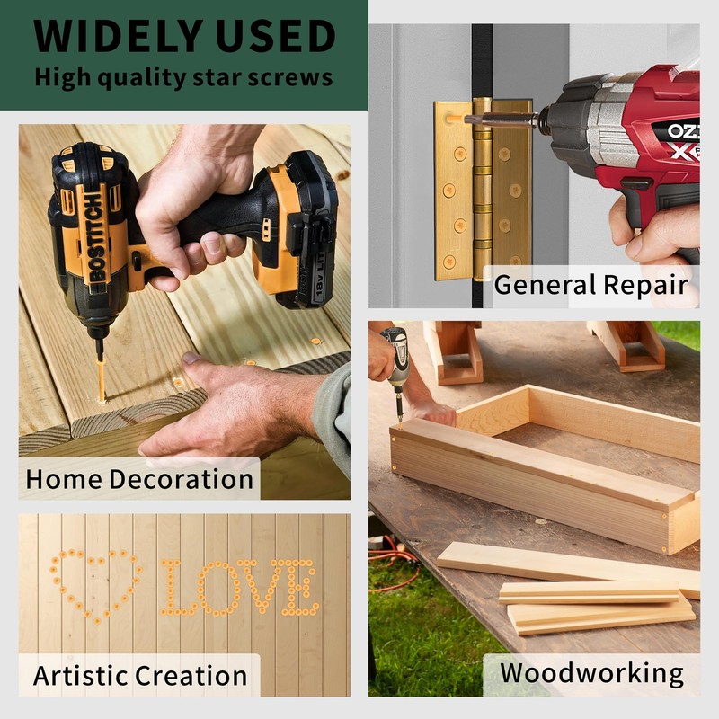 - 【Unique Design】We design our special thread-cutting screws with sharp self tapping cut and T25 star drive head . It can not only start drilling holes rapidly without pre-drilling but also make the contact surface smooth and avoid wood splitting. Star shaped screw heads can prevent screws from slipping off the drill bit during the screwing process.