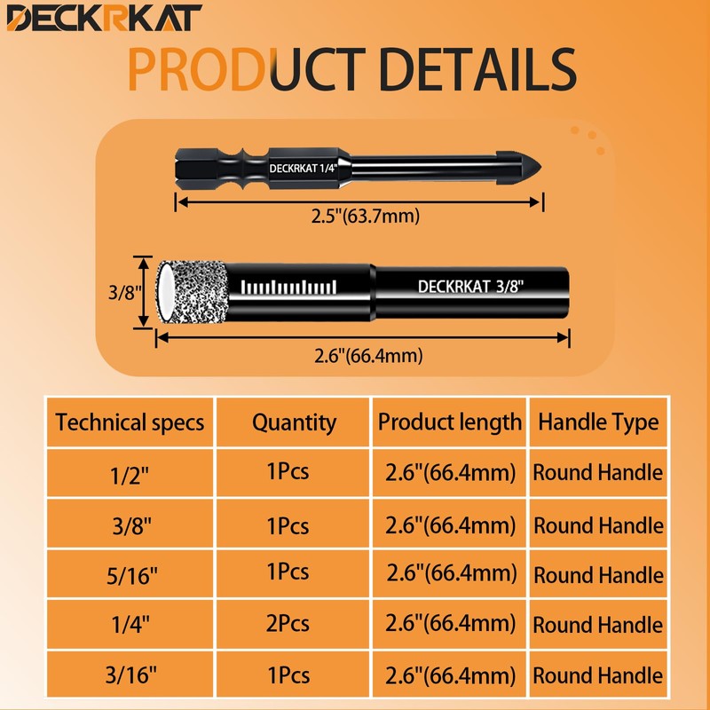 DECKRKAT 7-Piece Dry Diamond Drill Bits & Carbide Tile Drill Bit Set for Tile,Ceramic,Marble,Porcelain,Glass & Granite- 3/16", 1/4" (x2), 5/16", 3/8", 1/2" + 1/4" Masonry Bit