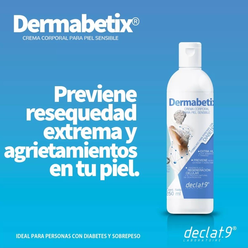 •Dermabetix es una crema corporal de uso diario para el cuidado intensivo de la piel. Especialmente formulada para personas que presentan piel delicada, dañada, con tirantez, asperezas, descamación, picazón intensa, resequedad extrema y/o agrietamiento. Nuestra exclusiva formula contiene ingredientes que al usarse diariamente coadyuvan contra las complicaciones crónicas de la piel, que pueden producir laceraciones o lesiones serias en la piel.