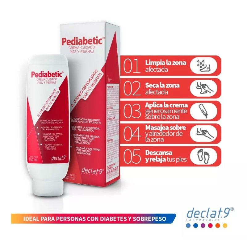 PEDIABETIC es una crema auxiliar para pies, piernas y extremidades en general especialmente formulada para personas con diabetes o sobrepeso que desarrollan problemas de circulación y que se manifiestan en pies fríos o hinchados, pérdida de sensibilidad, músculos tensos, resequedad extrema y agrietamiento en la piel.