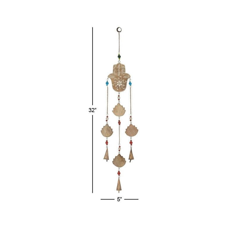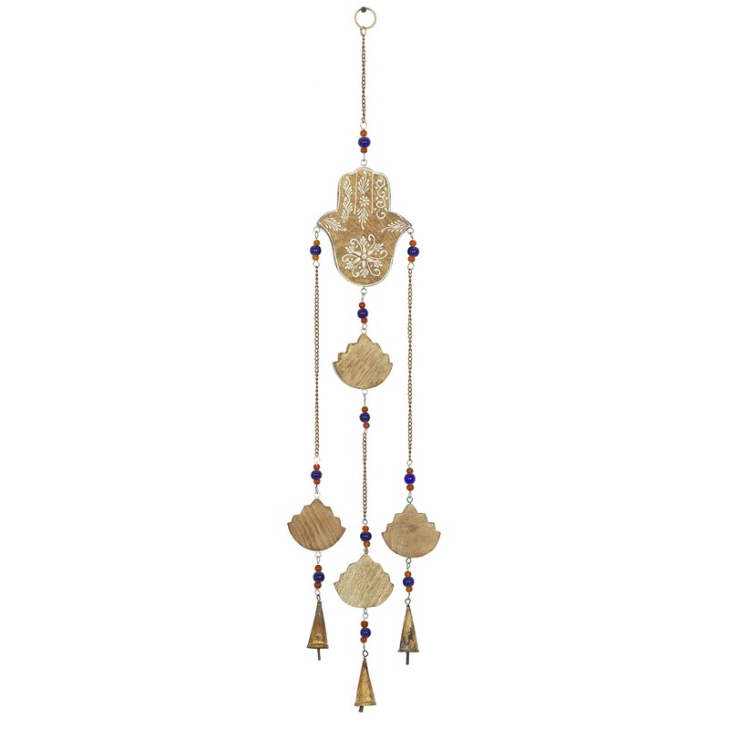 - BROWN AND MULTI COLORED NATURAL FINISH: Features colored glass beads in red and blue, natural brown wood and metallic bells hang on chains