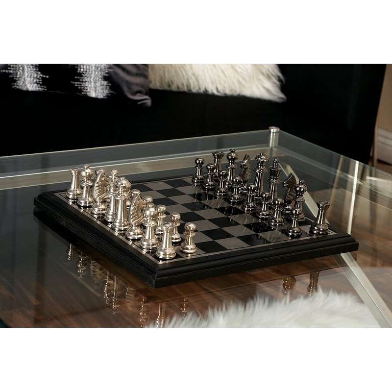 1 inch updated traditional aluminum chess set in gunmetal grey and silver featuring matching authentic chess pieces in a polished finish. Suitable to use as a decorative item. Unique home decor. This product is manufactured in India.