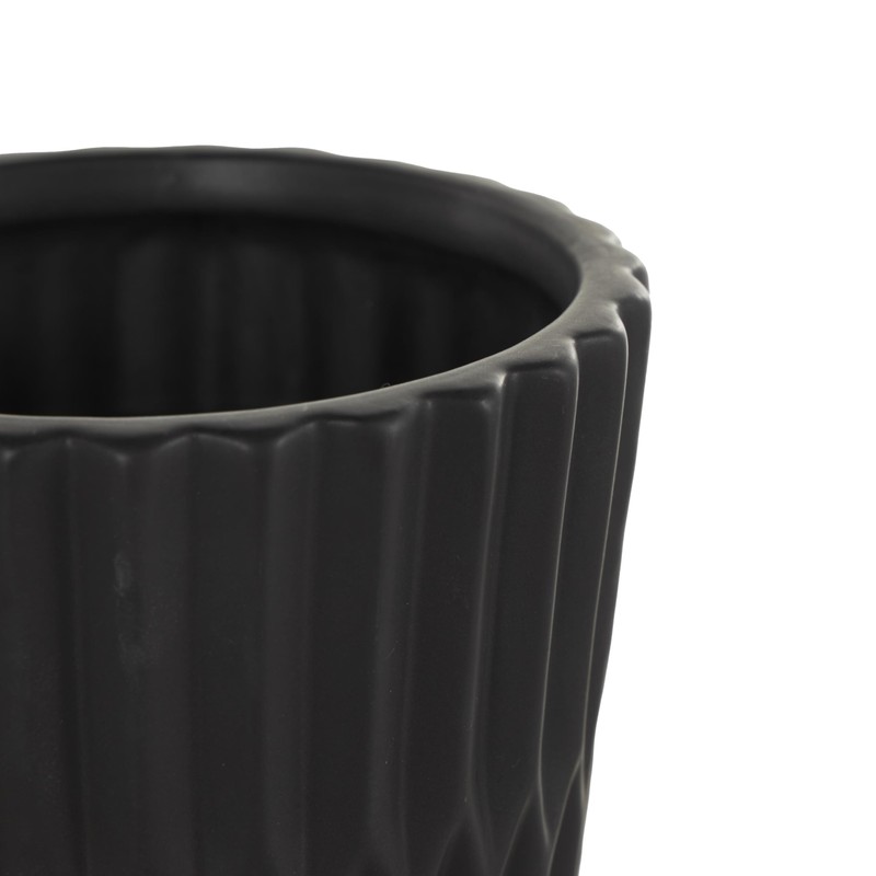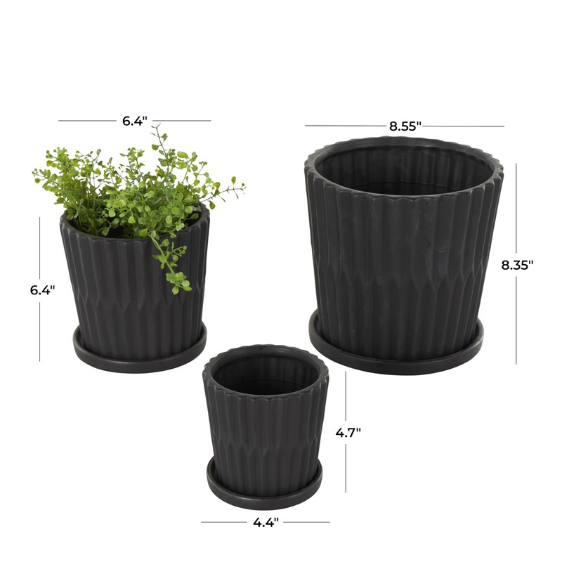 Deco 79 Ceramic Indoor Outdoor Planter Ribbed Large Planter Pot with Attached Saucer, Set of 3 Planters 8",6",5"H, Black