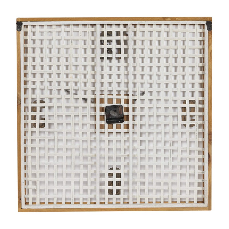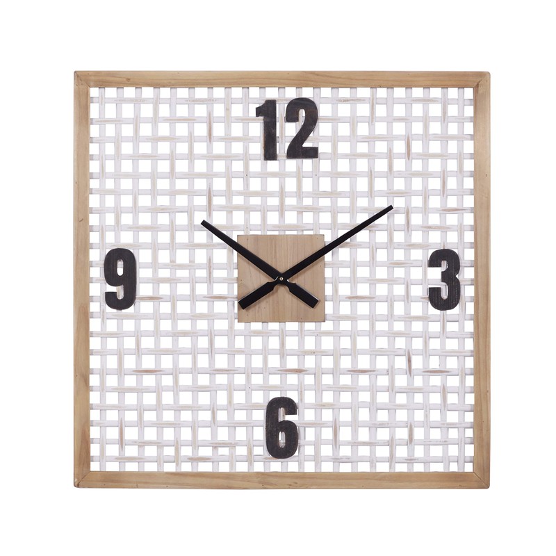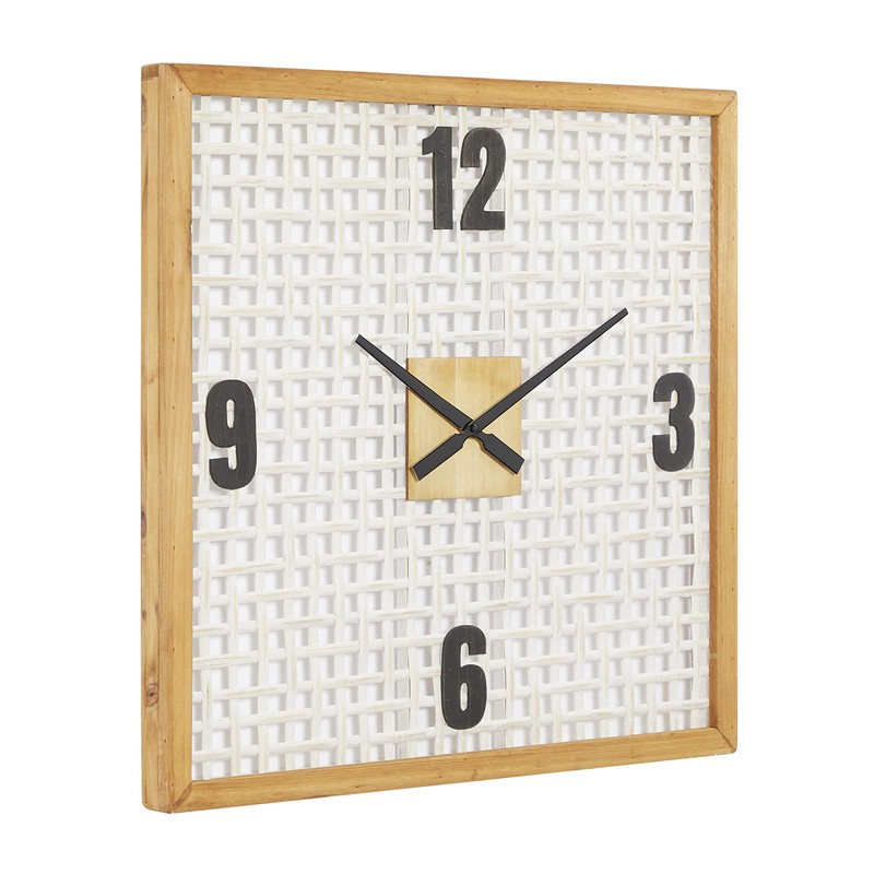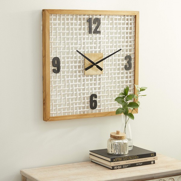 - This wall clock features a farmhouse style inspired wood and glass construction with a geometric square design