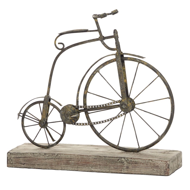 • A vintage themed bicycle sculpture that features a solid dark brown finished iron with a distressed look