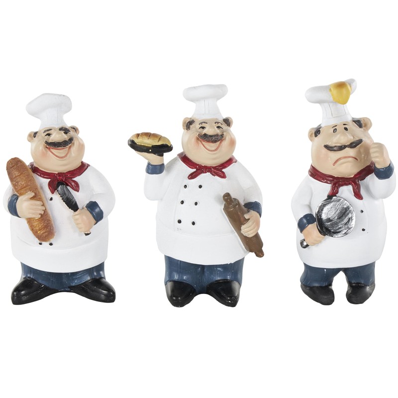 - FEATURES CHEF SCULPTURE: Each of the 3 chef figurine holds different cooked food and depicts the different facial expressions for an inviting appeal
