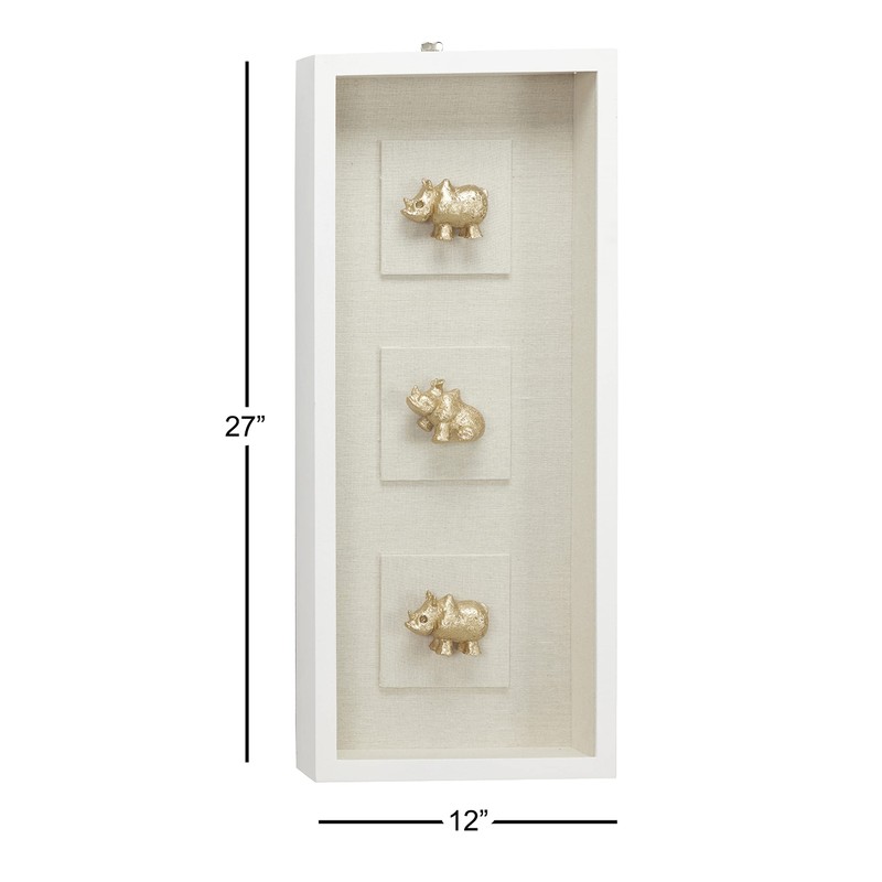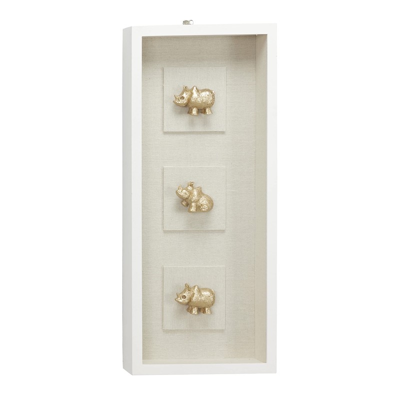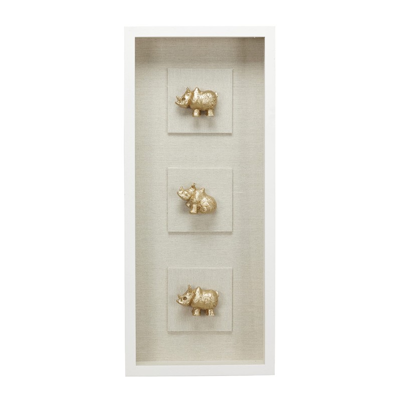• Three small, metallic gold rhinoceros sculptures in a vertical column, each adhered to a light wheat beige linen square over a matching wheat beige rectangular linen backing; entire wall decor piece is housed in a white frame