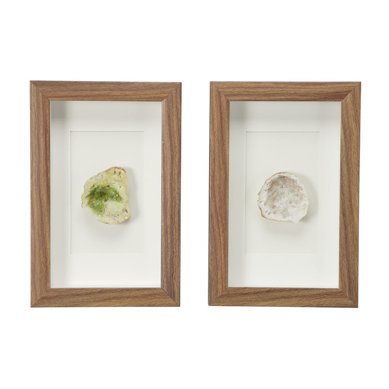 - Crystal geodes, white paper mat boards, and Chinese fir wood frames