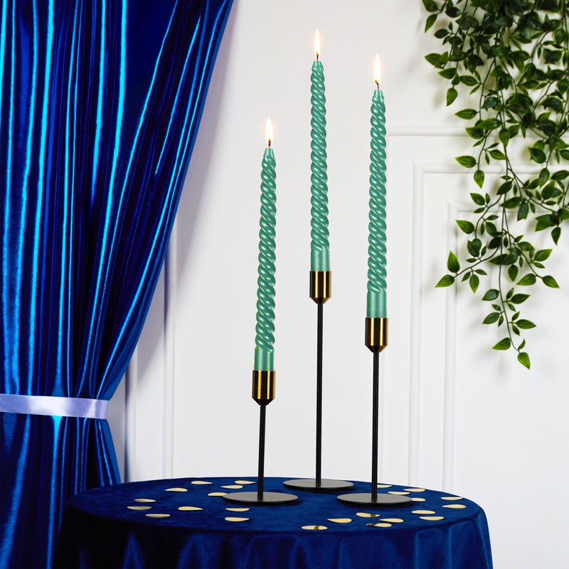 DECO EXPRESS Dinner Candles Pack of 3 or 6 Twisted Non Drip Coloured Spiral Candles Long Lasting 6 Hours Burn Non Scented (Metallic Pine, Pack of 6)