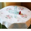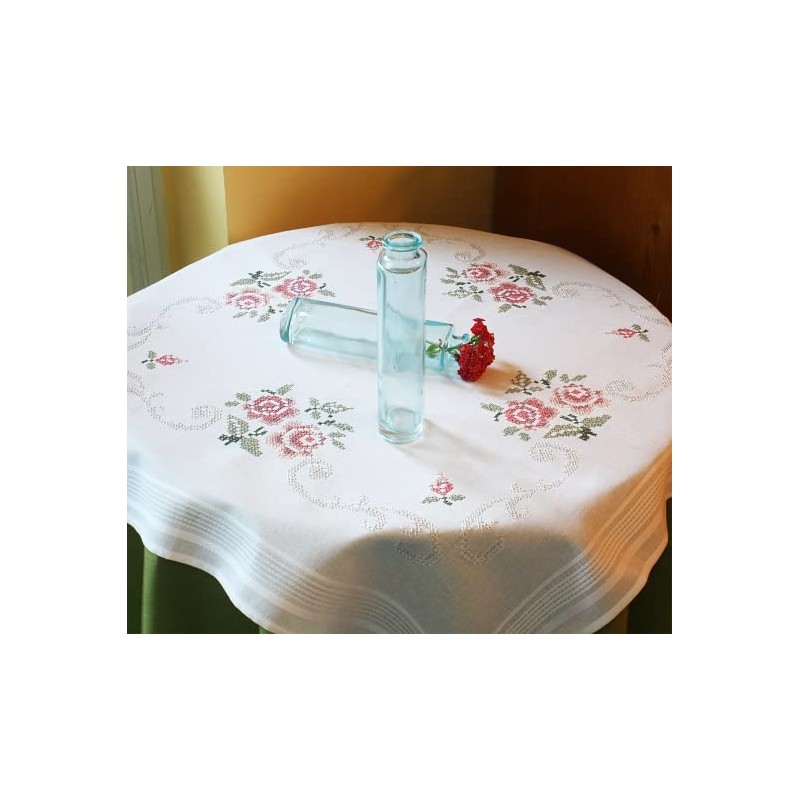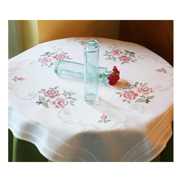 DECO-LINE Pink Rose Printed Tablecloth Embroidery KIT, White, 80 X 80 cm