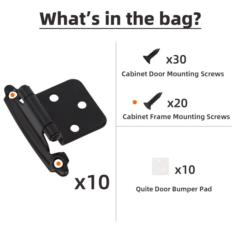 - NEWLY UPGRADED HINGE SCREWS. The Decobasics surface mount black kitchen cabinet hinges come with newly strengthened 5/8 screws to ensure a perfect fit, even using with power tools. Separately packed with silicon cabinet door bumpers for your convenience.