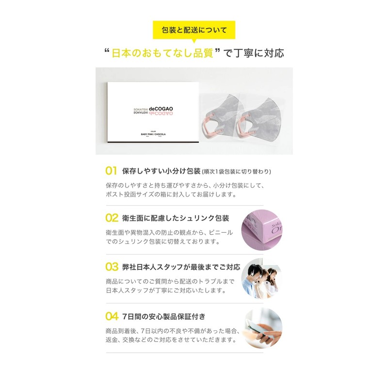 【商品説明】 SOKAITEKIシリーズの小顔見せを叶えるマスクdeCOGAO』です より顔に密着しやすいノーズフィッターを採用し、メガネが曇りにくい しっかり顔にフィットするのに呼吸がしやすい3D立体形状のマスクです 長時間着用しても耳が痛くなりにくい超やわらかゴム紐で、着用時のストレスを軽減します カラー展開はバイカラー6色と単色6色の合わせて12色 気分やファッションに合わせてご使用いただけます -SOKAITEKIについて 日本人が日本人の為に作った、快適性と安心安全を追求したマスクシリーズ -SOKAITEKI公式販売店 MARY PLUS+はSOKAITEKIシリーズを生産販売する公式メーカーです 【サイズ(折りたたみ時のサイズ)】 No.9:約 126 × 114 mm No.8:約 135 × 100 mm No.7:約 129 × 112 mm 【カラー】 01.ブラック / 02.ヘーゼルナッツ / 03.ライラック 04.ベビーピンク / 05.アイスグレー / 06.ホワイト 07.ホワイト×レッド / 08.ブラック×ベビーピンク 09.ヘーゼルナッツ×レッド / 10.ライラック×ブラック 11.ベビーピンク×ショコラ / 12.アイスグレー×ピンク 13.グレージュ / 14.グレー×ブラック 15.オフホワイト / 16.オフホワイト×ブラック 17.モカブラウン×ブラック / 18.グレージュ×ショコラ 19.アイボリー×ブラック / 20.グレージュ×レッド 【素 材】 本体フィルター部分:ポリプロピレン 耳ゴム部分:ポリウレタン、ポリエステル 包装材:紙、プラスチック