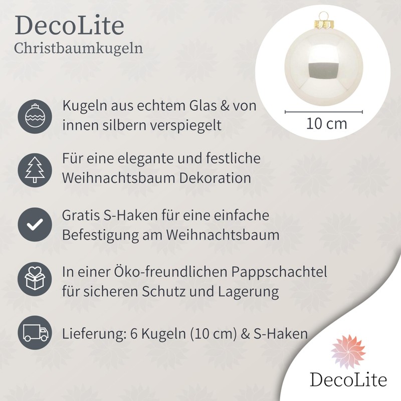 - 🎄 Exclusive set: 6 high-quality glass Christmas baubles (10 cm) designed and made in Germany exclusively for DecoLite, offering a perfect combination of tradition and quality.