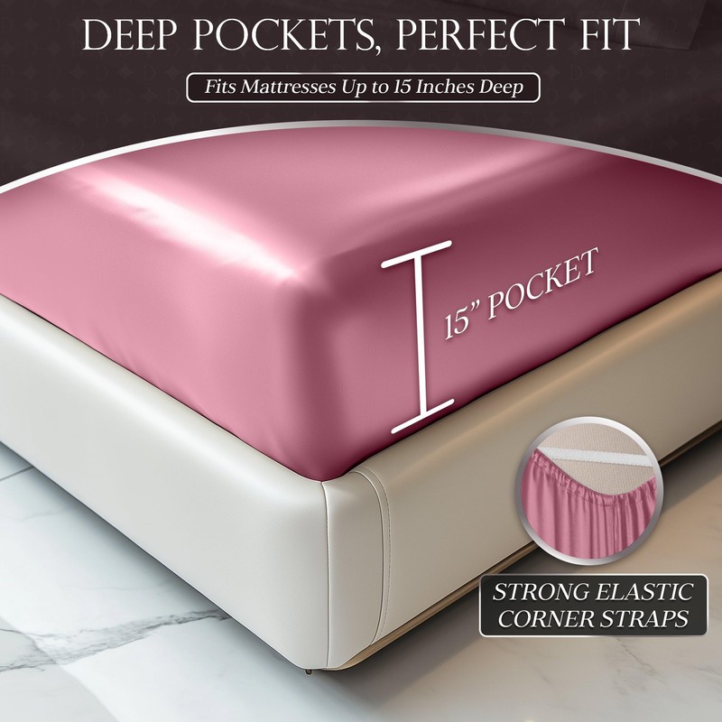 - PERFECT FIT WITH DEEP POCKETS: Say goodbye to the slipping sheet. With 15-inch deep pockets and reinforced elastic straps, our silk satin king sheet stays in place on pillowtops and adjustable mattresses, giving your bed a smooth, flawless finish every time