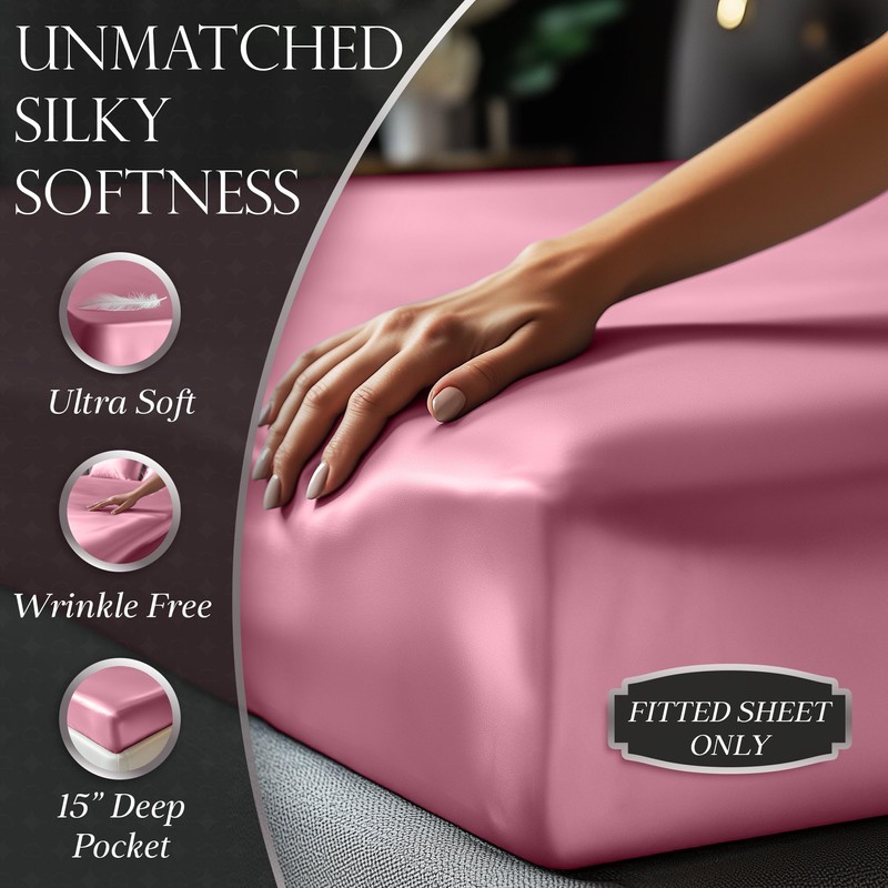 - GENTLE, SILKY CARE: Indulge your hair and skin with our luxurious pink satin fitted bed sheet. Our satin sheet king minimizes friction, preventing breakage, frizz, and wrinkles, so both you and your bed wake up loofull refreshed and radiant every morning
