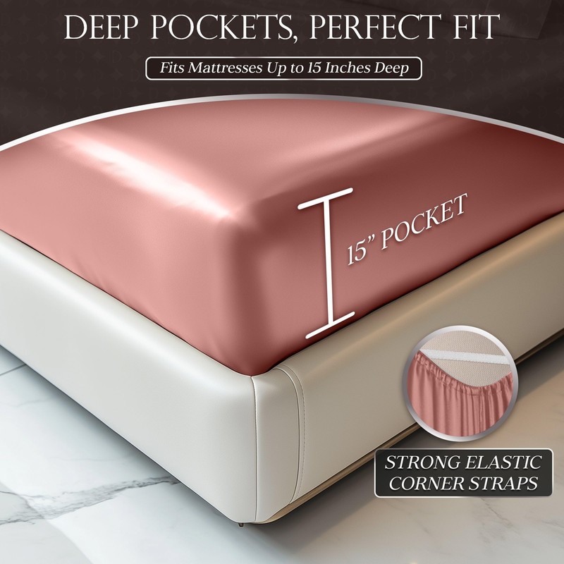 - PERFECT FIT WITH DEEP POCKETS: Say goodbye to the slipping sheet. With 15-inch deep pockets and reinforced elastic straps, our silk satin queen sheet stays in place on pillowtops and adjustable mattresses, giving your bed a smooth, flawless finish every time