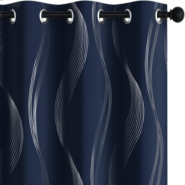 Deconovo Blackout Grommet Silver Curved Wave Pattern Printed Curtains, Navy Blue, 66W x 84L