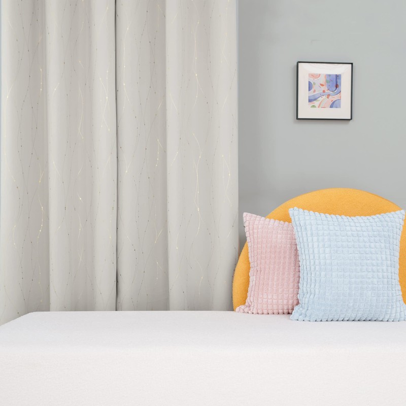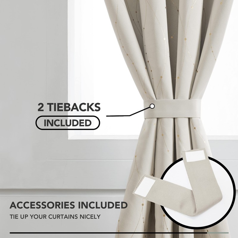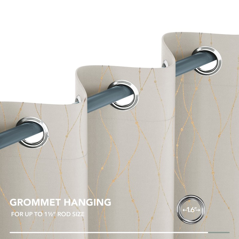 - 【Design and Texture】: These blackout curtains for living room and bedroom have a beautiful gold foil printed wave lines with dots pattern that looks luxurious and high-end. The 100% polyester fabric feels soft, drapery, and silky to the touch.