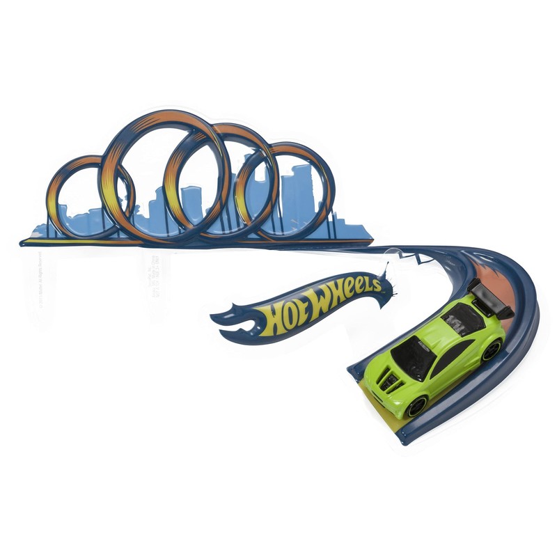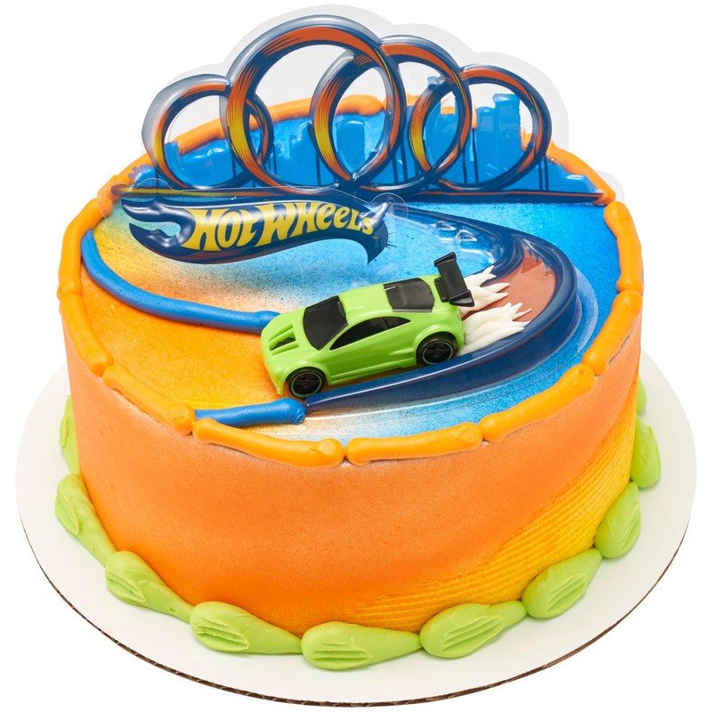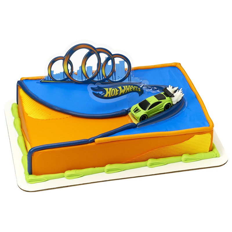 - Set features a Hot Wheels track with a bright green car. Car has wheels that turn and can be used as a toy after use as a cake decoration.