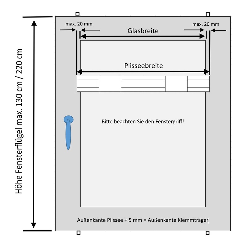 Please note that the tension cords are only slightly longer than the specified pleated length to prevent over-tensioning of the pleated blind. It is therefore not possible to attach pleated blinds to much higher window casements.