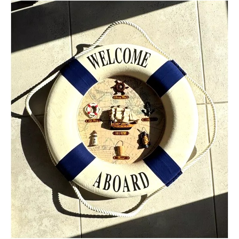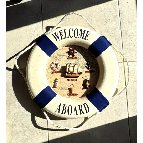 Decor 20" Blue Welcome Aboard Life Preserver/Buoy with Rope +3D Decor Wall Hanging