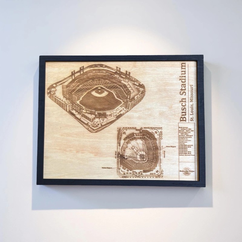STADIUM ARTWORK: Detailed laser-engraved wooden stadium blueprint of Busch Stadium in St. Louis, Missouri, featuring both aerial and seating chart views