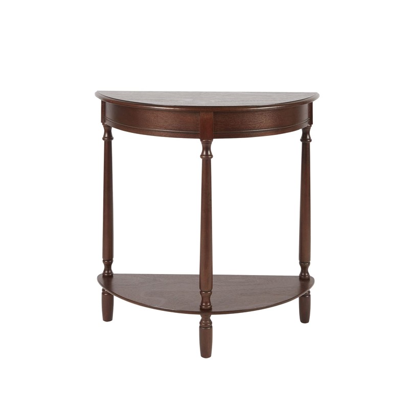 The traditionally designed half round console table is a multipurpose accent table. Imagine it greeting guests in the entryway, dressing a blank living room wall or even providing storage in a home office. A lower shelf doubles your storage capability. An elegant Walnut finish creates a stately look while the solids and MDF construction creates long lasting durability-combined this is timeless, functional console table. Easy to assemble. Table measures 28.25w 11.8d 28.25h