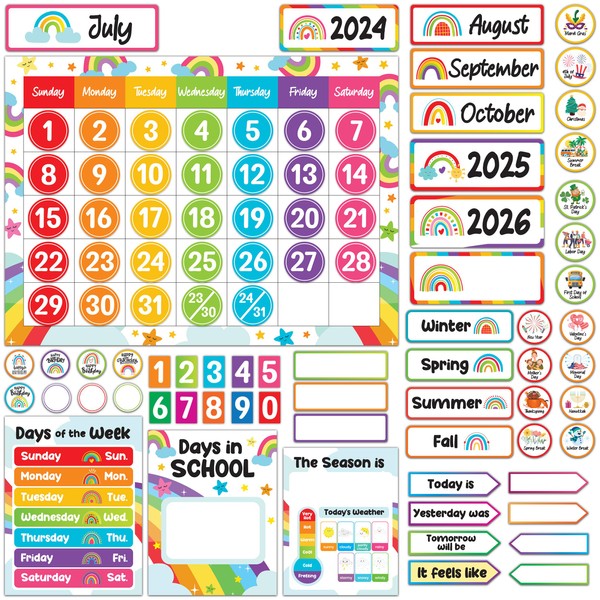 Decorably 147 Pcs Cutouts Rainbow Vibrant Class Calendar Bulletin Board Set with Borders, Kindergarten Calendar for Classroom Bulletin Board Decorations