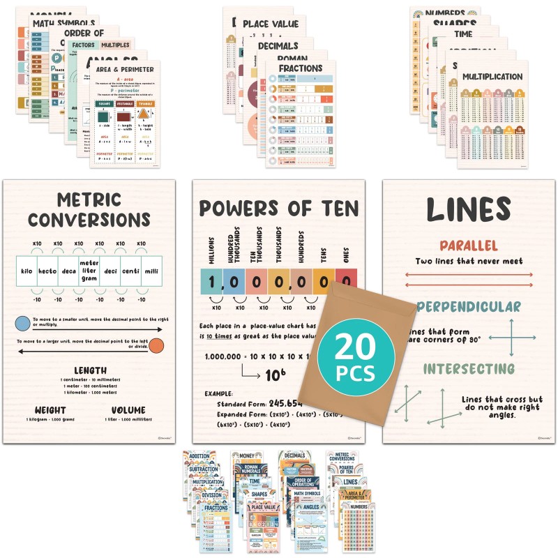 Decorably 20 Math Posters for Elementary Classroom, 11x17in Matte-Laminated Educational...