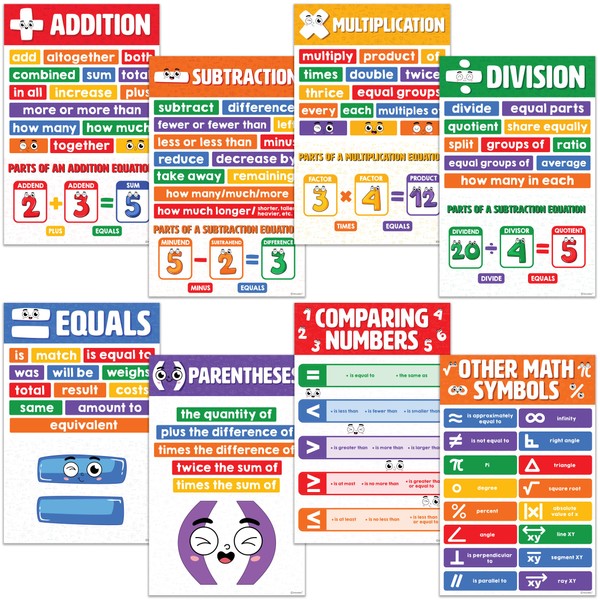 Decorably 8 Math Key Words Posters, 11x17in Matte-Laminated Educational Math Word Problem Posters for Elementary, Middle School - School Hallways, Bulletin Boards, Home Study Room