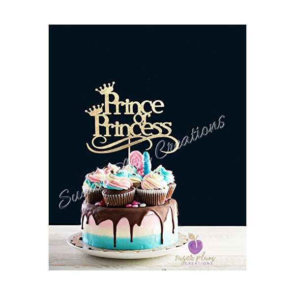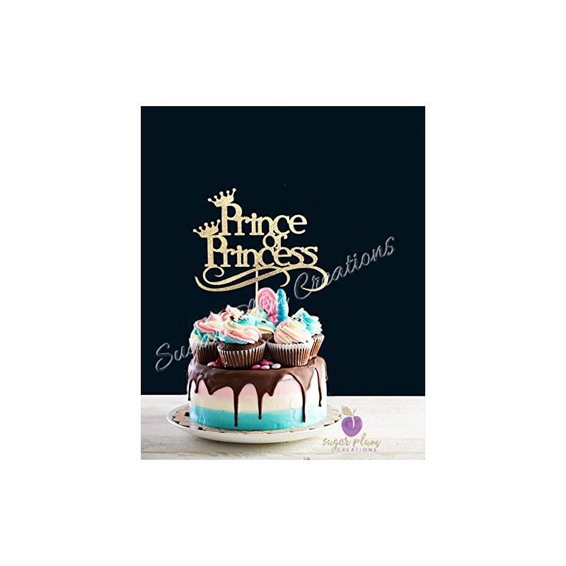 La decoración para tarta de príncipe o princesa está hecha con cartulina dorada con purpurina en un lado. La parte posterior de la decoración es blanca. El material es cartulina con purpurina. La decoración mide 16,5 cm de ancho y 12,7 cm de altura. Se fija a un palo de 6 pulgadas. Incluye un corazón azul y un corazón rosa.