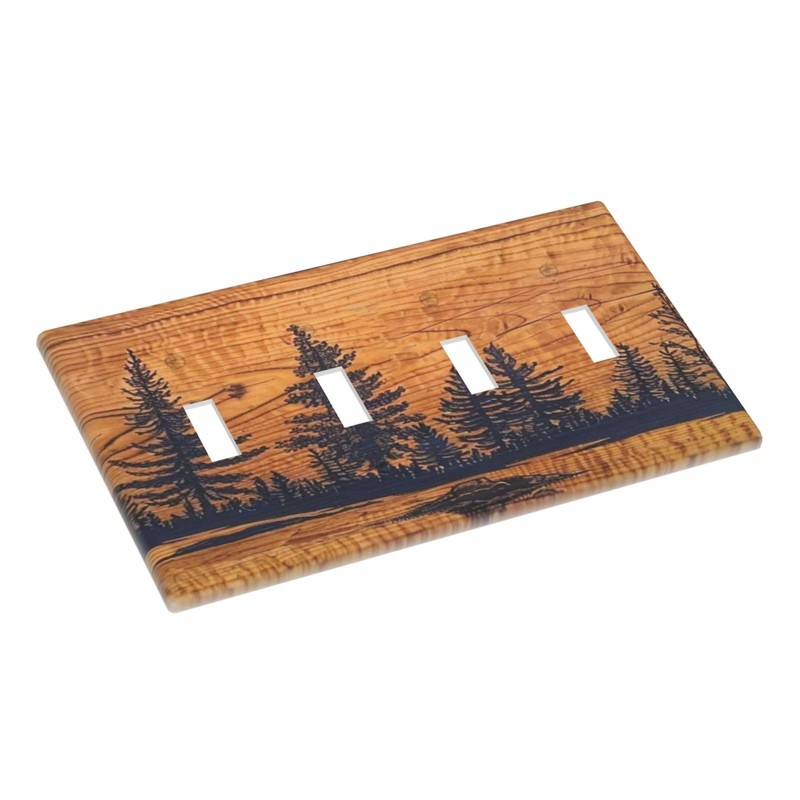 Decorative 4 Gang Quad Toggle Light Switch Cover Retro Forest Pine Tree Jungle Woodland Woods Brown Wood Lodge Wooden Style Electrical Four Device Decorator Wall Plate Standard Size Outlet Covers