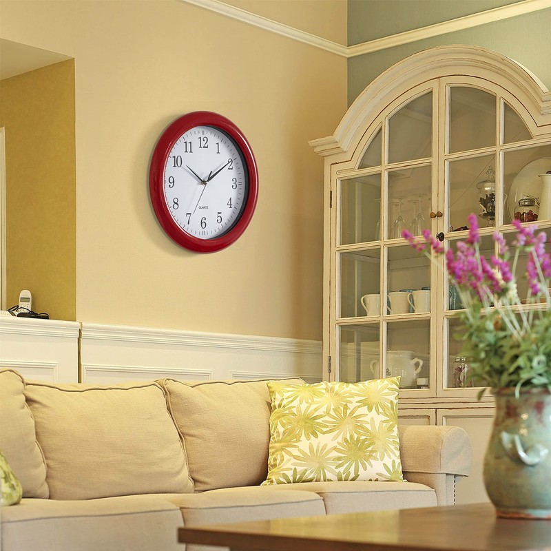 Decorative Classic Round Wall Clock for Living Room, Kitchen, Dining Room, Plastic (Red)