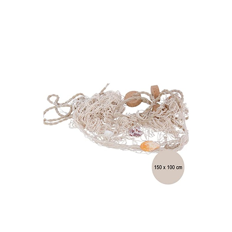 - The fishing net impresses with a size of 150 x 100 cm. Eyecatchers are the brown floats on the sides. The stitches are approximately five by five centimetres in size. Can also be used for theme parties such as beach parties or as a decorative element for weddings and birthdays.