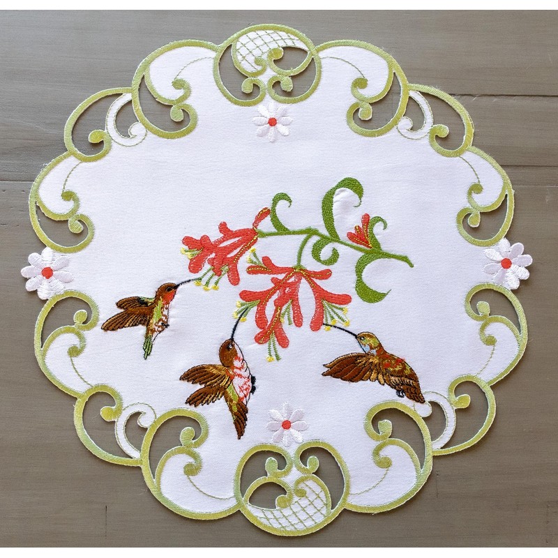 - DESIGN FEATURES: Elegant white doily with decorative green scrollwork border and beautifully embroidered hummingbirds feeding from coral-colored flowers