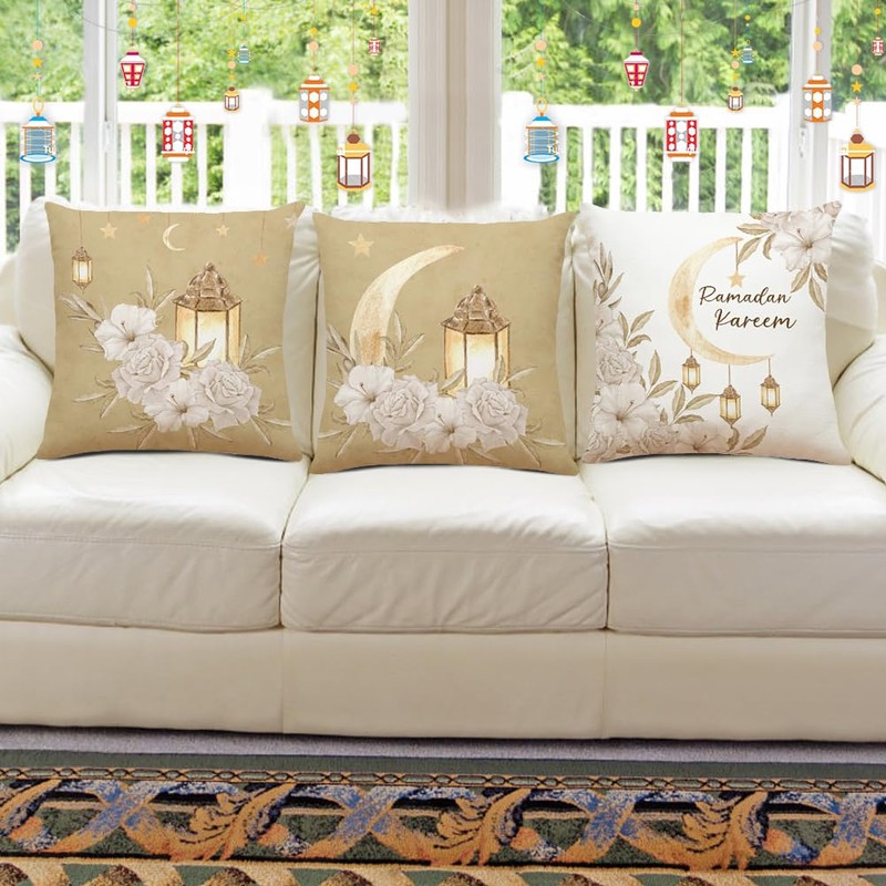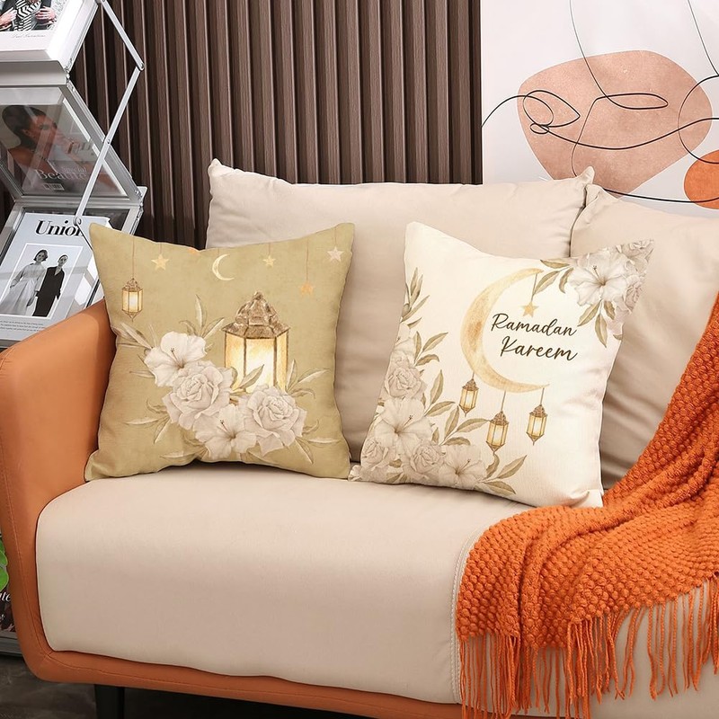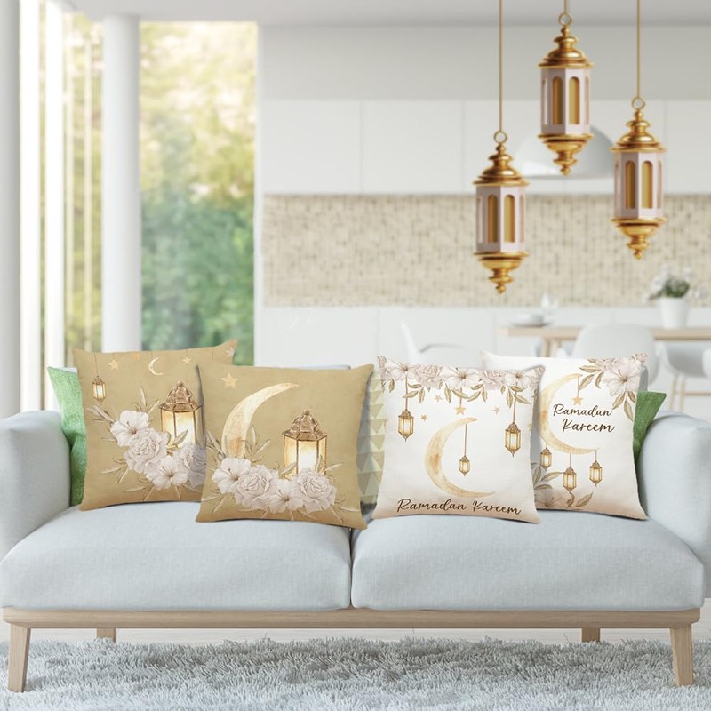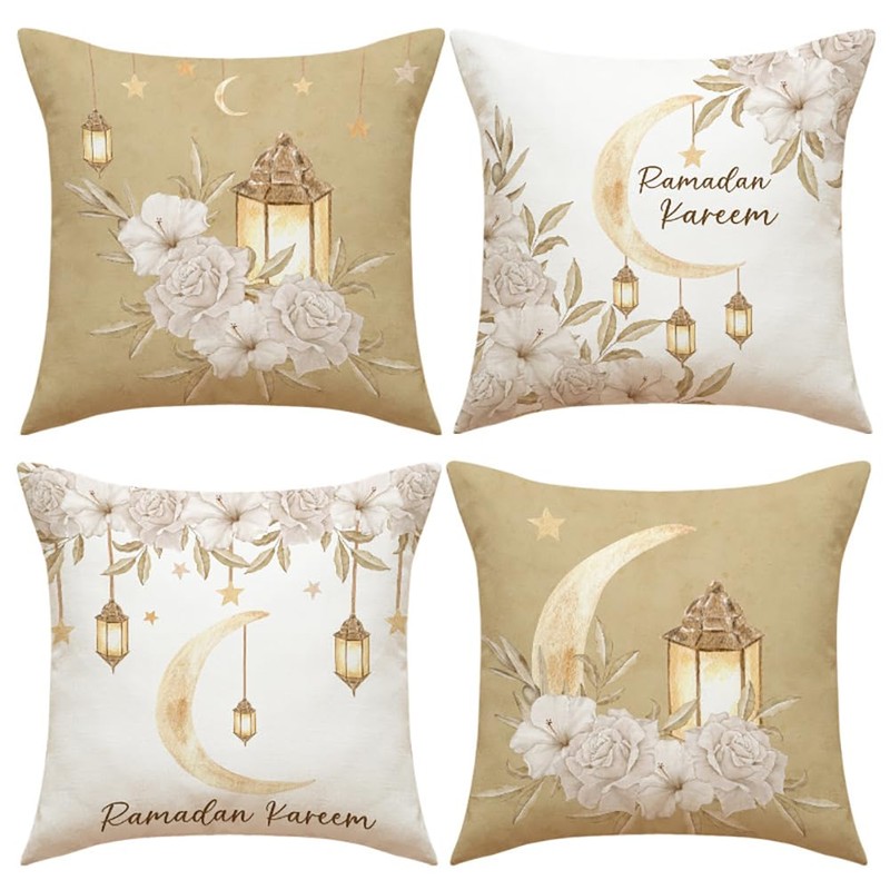 - Stylish Design Set: Set of 4 pillow cases with Islamic lunar and lantern motifs in sophisticated golden schemes.