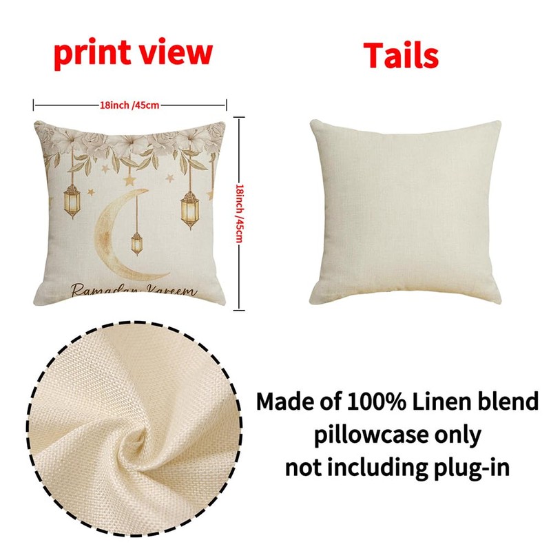 Decorative Modern Pillow Cover, Linen, Set of 4, 18x18 inches, Ramadan Mubarak Design, Mosque Lattern, Islamic Mubarak, Car, Chair Pillow Islamic Lunar and Lantern Decor, Style 1