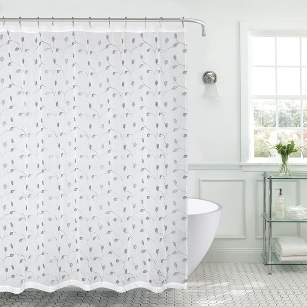 - Sophisticated Botanical Embroidery: This sheer white shower curtain features a beautifully embroidered botanical design, with intricate floral patterns that add a natural, elegant touch to your bathroom. The metallic silver threading weaves through the embroidery, enhancing the look with a refined shimmer, giving your bathroom a luxurious, nature-inspired ambiance perfect for any decor.