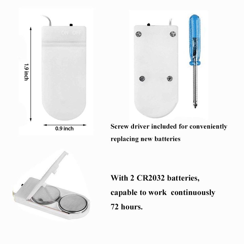 **An Amazing Tool For DIY** **Decorman 15 Pack 20 Leds Fairy String Lights - Your Best Partners to Decorate Your Romantic Space With** **Main Features:** **\- Widely Use with Decorman String Lights** **\- High Quality Flexible Silver Coated Wire** **\- Bright Premium Quality Micro LED Lights** **\- Safe to use and Not Overheat** **\- Easy to Operate With a ON/OFF Switch** **\- High Quality Waterproof Except Battery Box** **Specification:** Brand: Decem Total length per string: 2M /6.6 feet Led Qty per light: 20 pieces Power Supply: 2x CR2032 Lithium Cells (included) Light Color: Warm White Battery life: 72 hours after continuous lighting Space between LEDs : 10cm / 4 inches Wire Color: Silver Package Size: 4 x 11 x 11cm(1.6 x 4.3 x 4.3in) Package Weight: 250g(0.6lb) **Package Includes:** 1 x Screw Driver 15 x Lovely Fairy String Lights(Battery Included) **Warm Notice:** 1.Please tear the protective films off before use. 2.The wire is not made of silver, only the color on the surface is silver, the internal wire is made of copper.