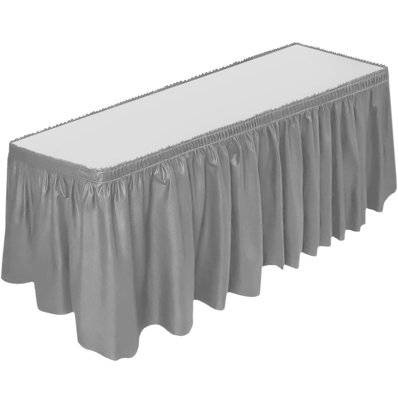 DecorRack Table Skirt, 29 in x 14 ft -BPA Free- Plastic Tableskirt, Disposable, Reusable, Rectangular Tablecloth Skirt, Silver (1 Pack)