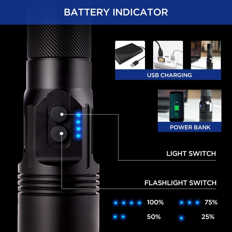 - 【Type-C Fast Recharging Durable &Your Power Bank】 The tactical pocket flashlight is Type-C fast recharging, which is powerful , durable and suitable for your outdoor activities. With lithium battery it is long lasting and quite safe and should be your best choice. It also can be used as power bank when you are in the wild, which ensures enough power for your electronic devices.