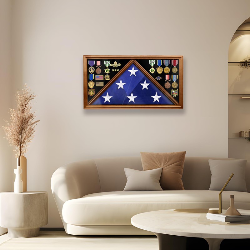 • ๐‚๐ซ๐š๐Ÿ๐ญ๐ž๐ ๐Ÿ๐จ๐ซ ๐•๐ž๐ญ๐ž๐ซ๐š๐ง๐ฌ ๐๐ฎ๐ซ๐ข๐š๐ฅ ๐…๐ฅ๐š๐ ๐ฌ: Designed specifically for 5'x9.5' American veteran burial flags, this military shadow box display case exudes timeless elegance. It serves as a poignant tribute to the valor and sacrifice of our servicemen and women, embodying respect and honor in its classic design. FLAG NOT INCLUDED. Please confirm the size of the flag before purchasing. If you have trouble fitting the flag, try refolding