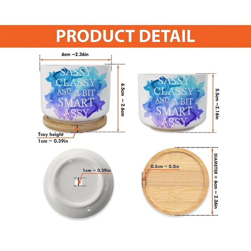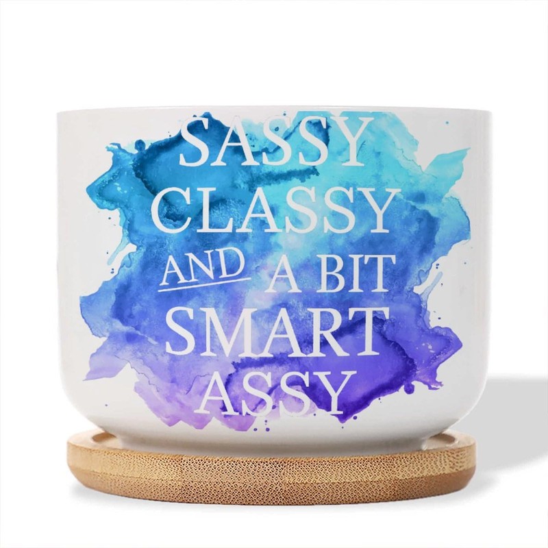 DecStic Sassy Classy and Smart Assy Planters Ceramic Quote Saying Round Plant Pots with Drainage Holes and Bamboo Tray Pot for Succulents Cactus Garden Windowsill