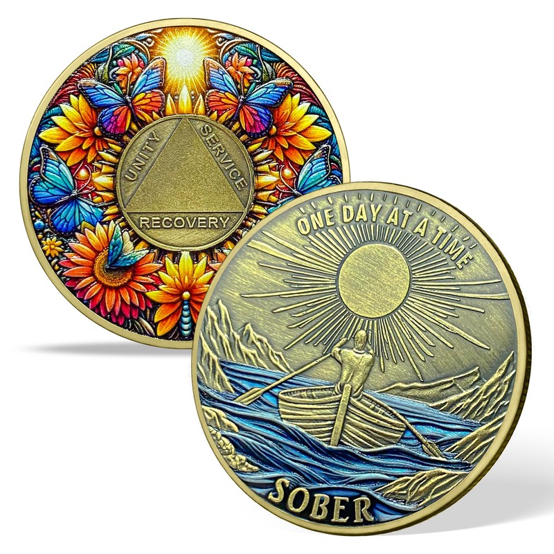 deDecoml Inspirational Sobriety Challenge Coin with Vibrant Nature and Recovery Symbols (4 Years)