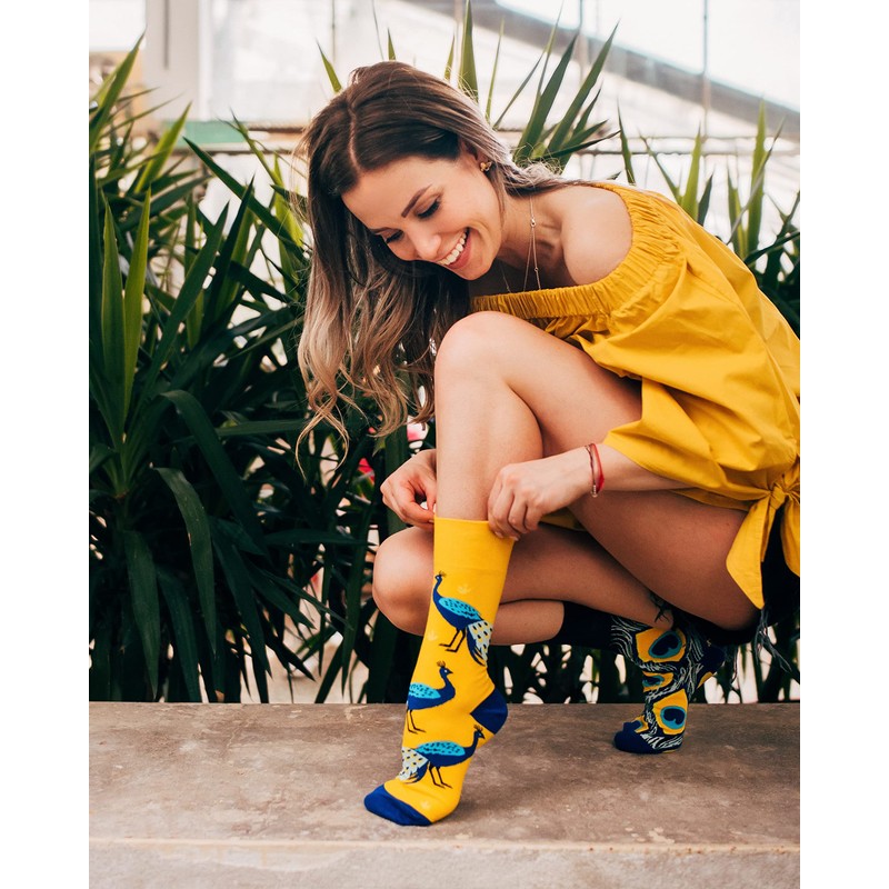 Dedoles Unisex Socks for Women, Men & Kids Cotton Funny Designs Football Bicycle Horses Plants Firefighter Gift Mismatched, Design: Wondrous Peafowl, Colour: Yellow, Size: 3-5 M / 2-4,5 W UK