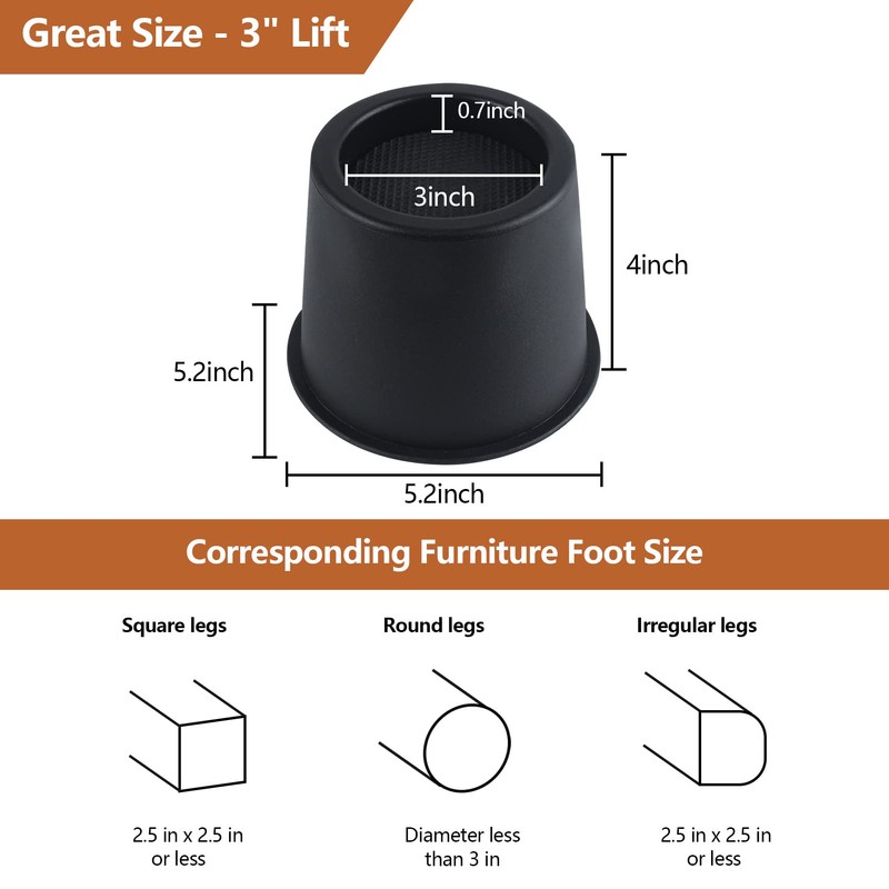 - 【EXTRA STORAGE & EASY CLEANING】: Bed elevators 3 inch can lift your bed up to 3 inches and are the perfect solution for small bedrooms and dorms with limited storage space, furniture risers 3 inch round add the extra height your bed needs and adds extra storage space under the bed, allowing you to stack debris or storage bins, and helps the robot sweep into the clean floor making it easier to clean the underside of your bed and keep the underside of your furniture free of dust and dirt