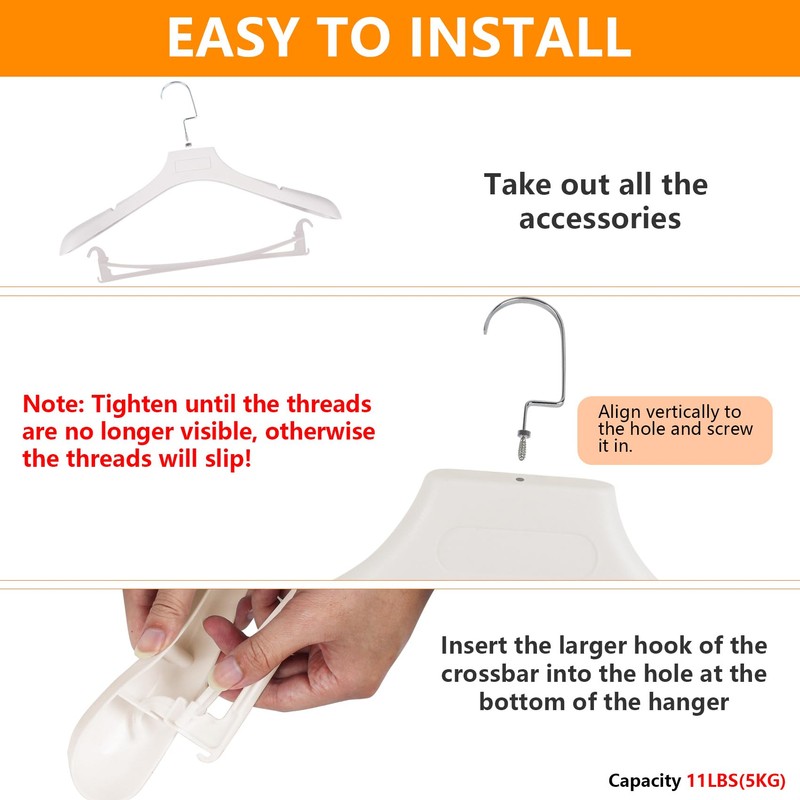 - 【EASY TO ASSEMBLE】: Our suit hangers for men come in separate pieces and require simple assembly. The package includes 15 ivory white hangers, 15 ivory white cross bars, 15 silver square hooks, and an installation instruction. Just follow the instructions for a straightforward process to obtain heavy-duty support hangers. These versatile suit coat hangers are suitable for a wide range of applications, making them ideal for organizing suits, coats, shirts, jackets, pants, dresses, and more